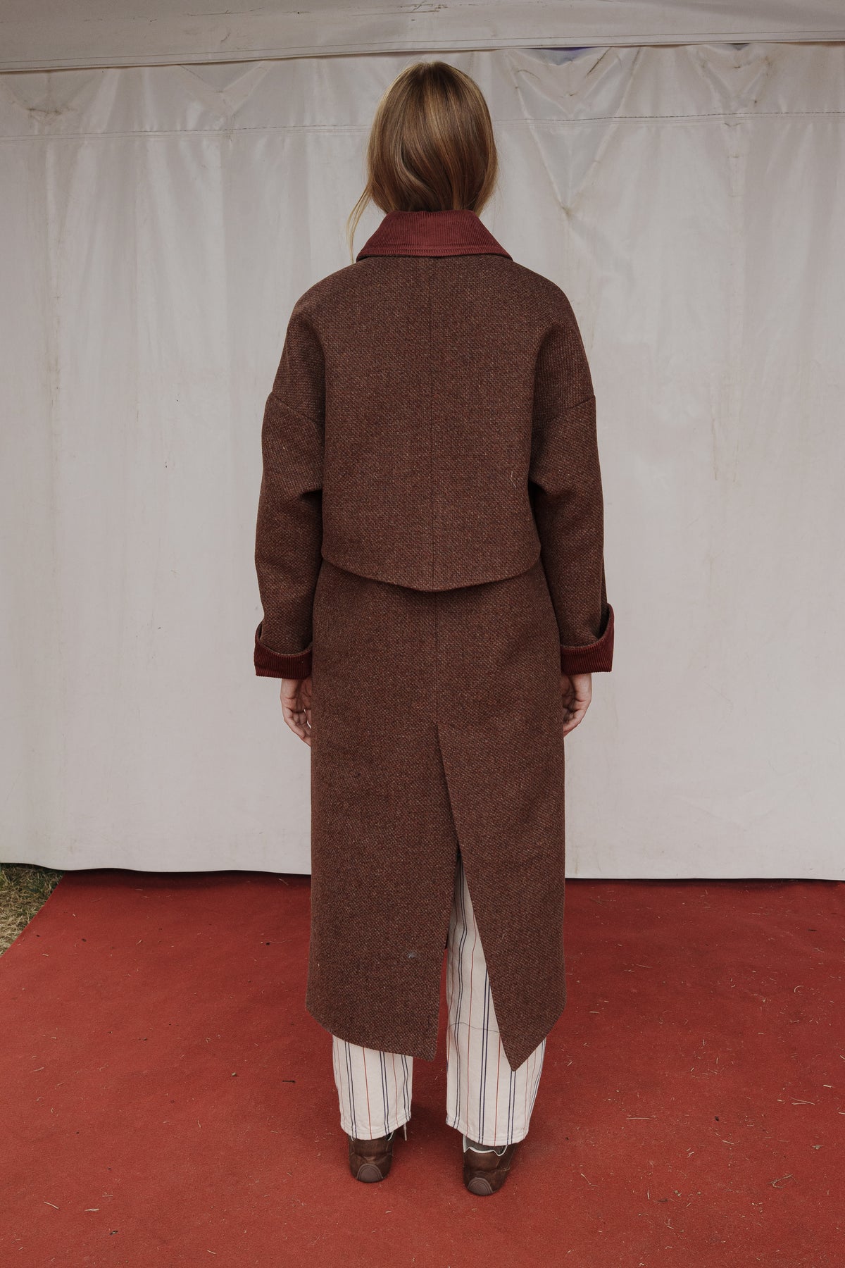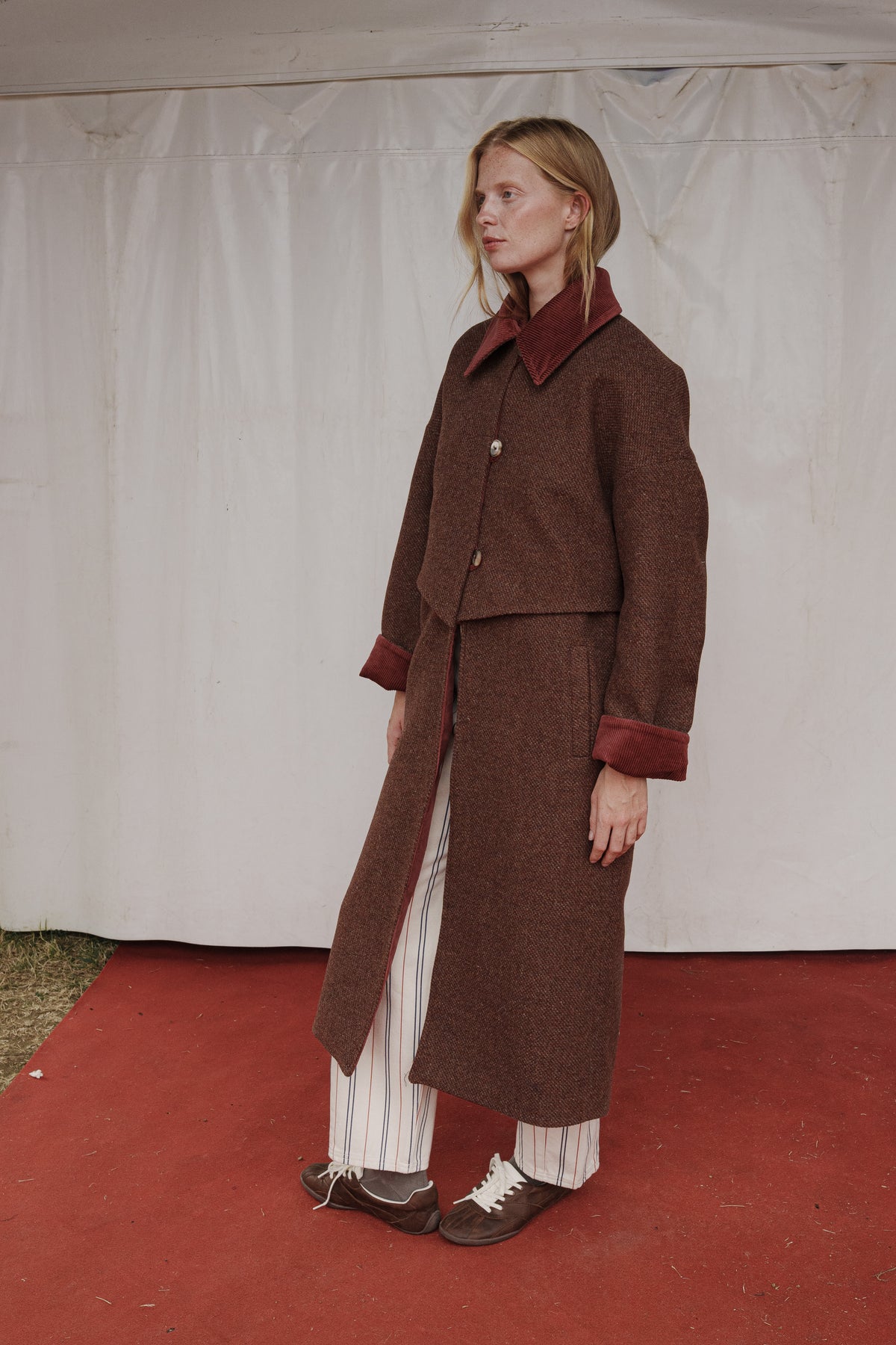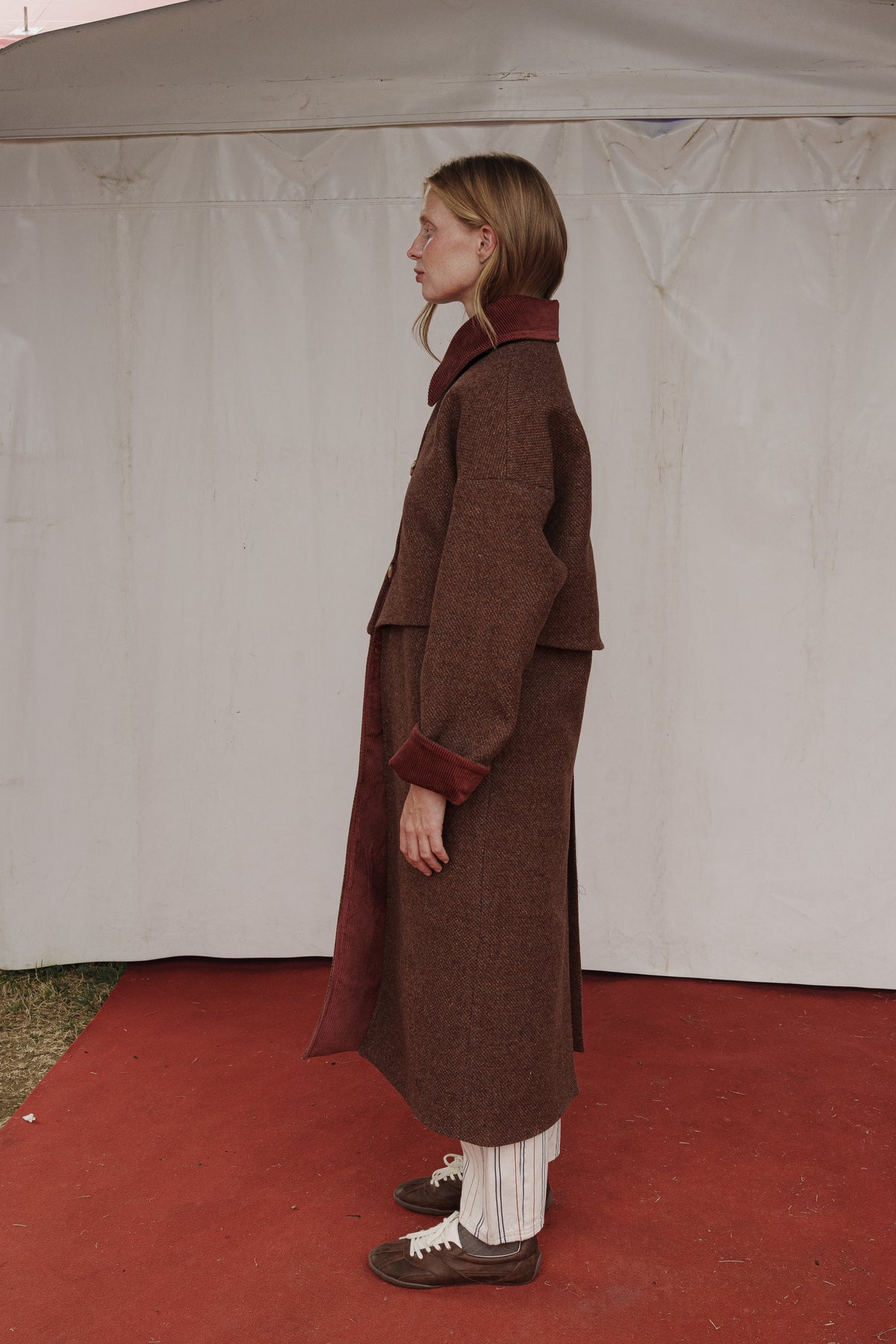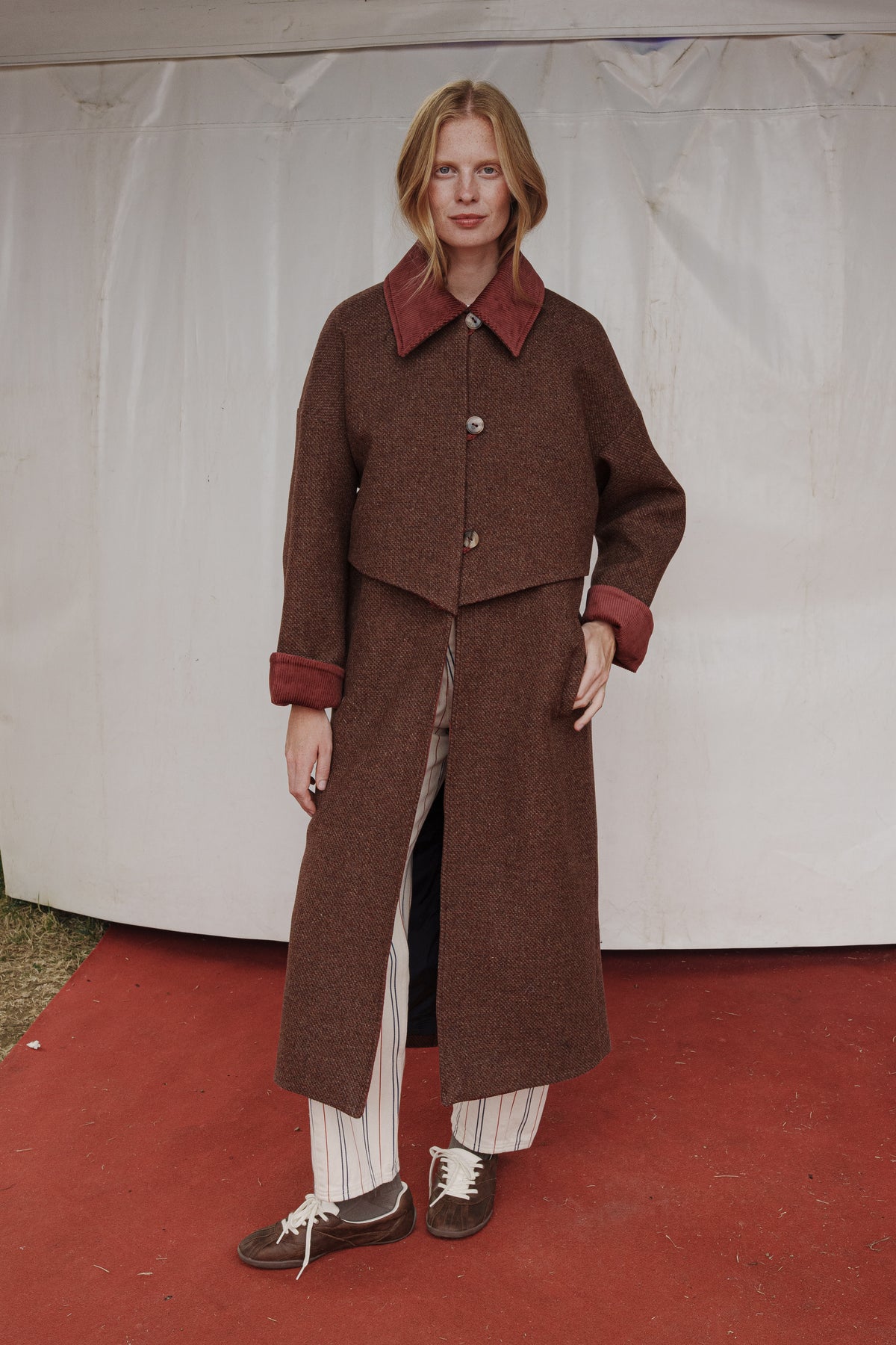 Abrigo de lana merino con manga caída, cierre con botones, largo midi y cuello desmontable en contraste.