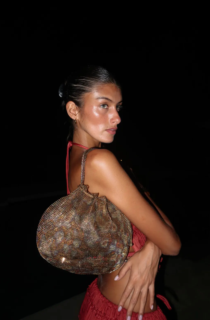 Handcrafted metal mesh bag with a drawstring closure and single handle.