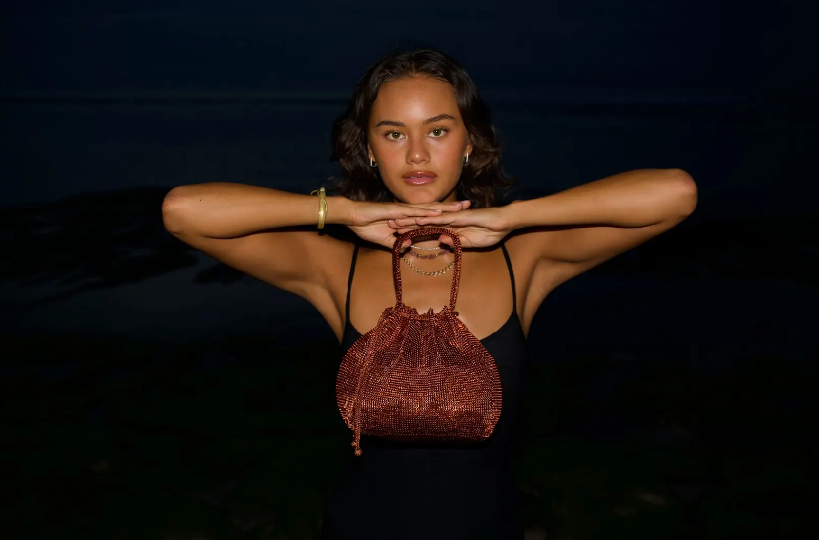 Handcrafted metal mesh bag with a drawstring closure and single handle.