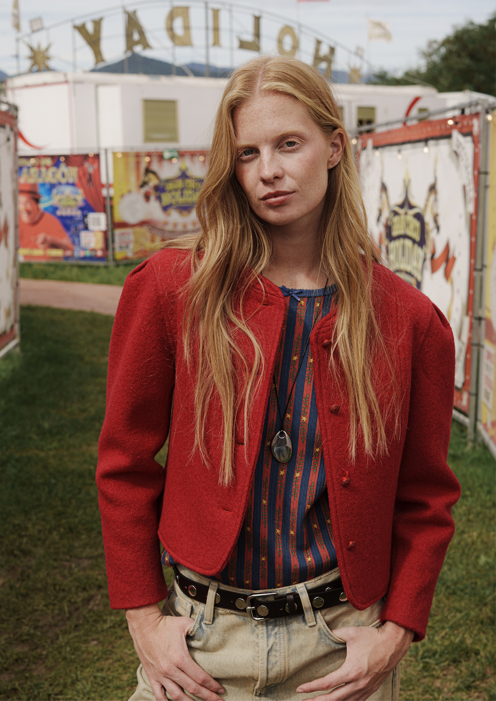 Camisa de corte recto y holgado con cuello tipo mao. En el pecho tiene un detalle en forma de babero con una fila doble de botones.