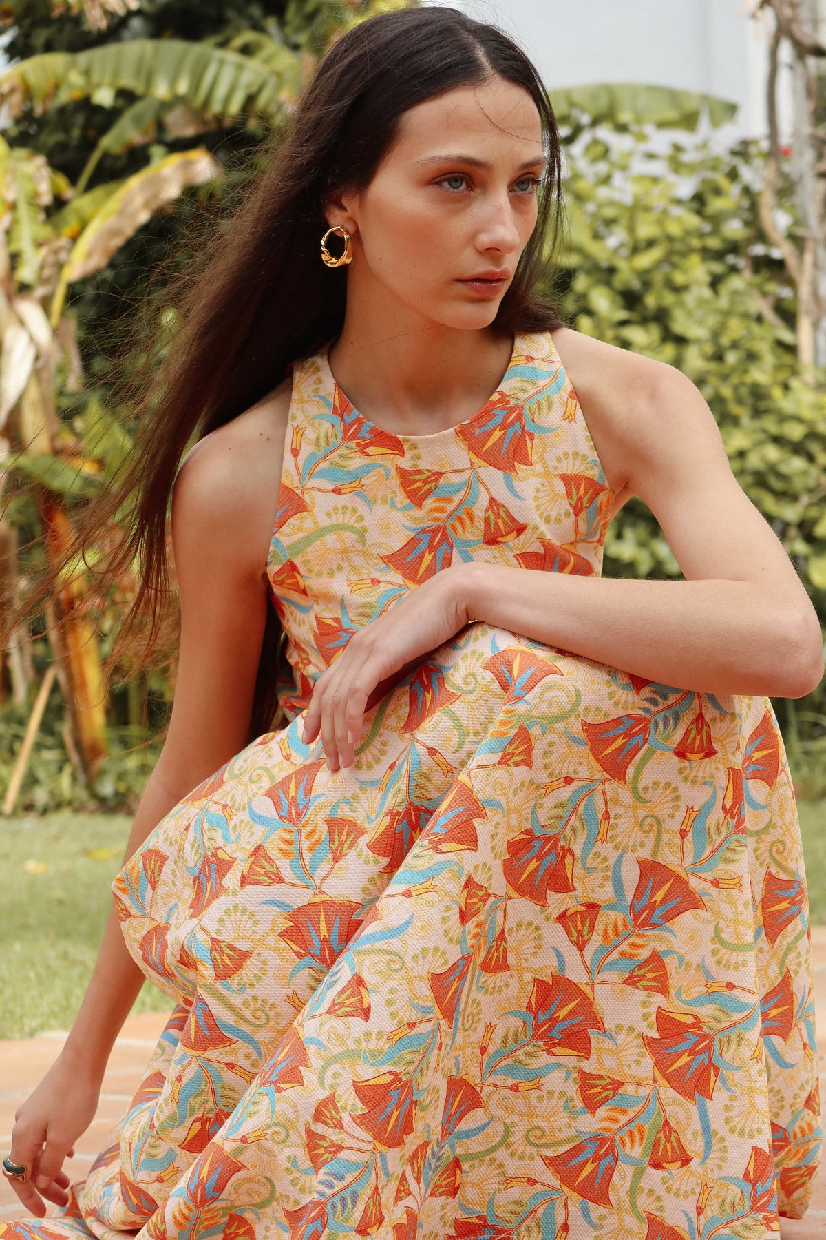 El Vestido Luxor Estampado es la pieza estrella para una invitada de boda que busca un equilibrio entre frescura y alta sofisticación. Con un diseño de cuello halter y espalda descubierta, este vestido largo destaca por su cuerpo entallado con detalles de mini volantes y una falda fluida que garantiza un movimiento espectacular. Su vibrante estampado floral en tonos naranja, turquesa y melocotón evoca una estética artística y veraniega, convirtiéndolo en el vestido de fiesta ideal para celebraciones de día o eventos exclusivos al aire libre donde la elegancia y el color son los protagonistas.