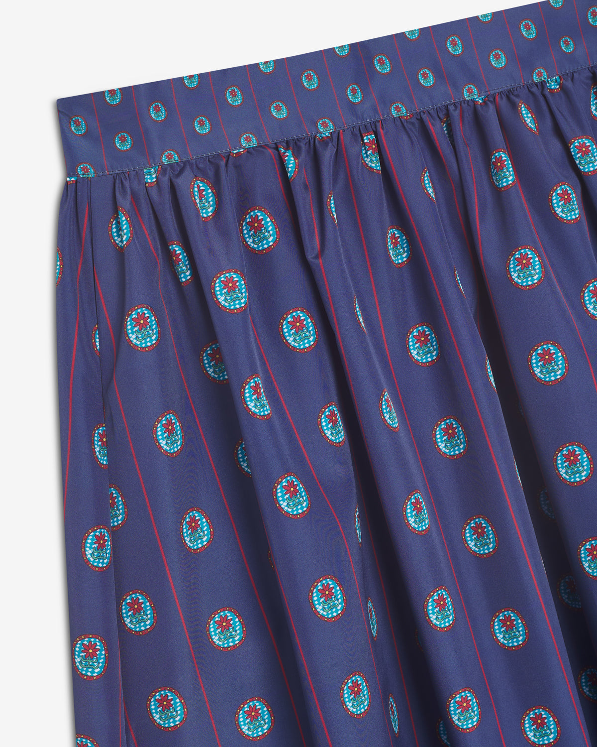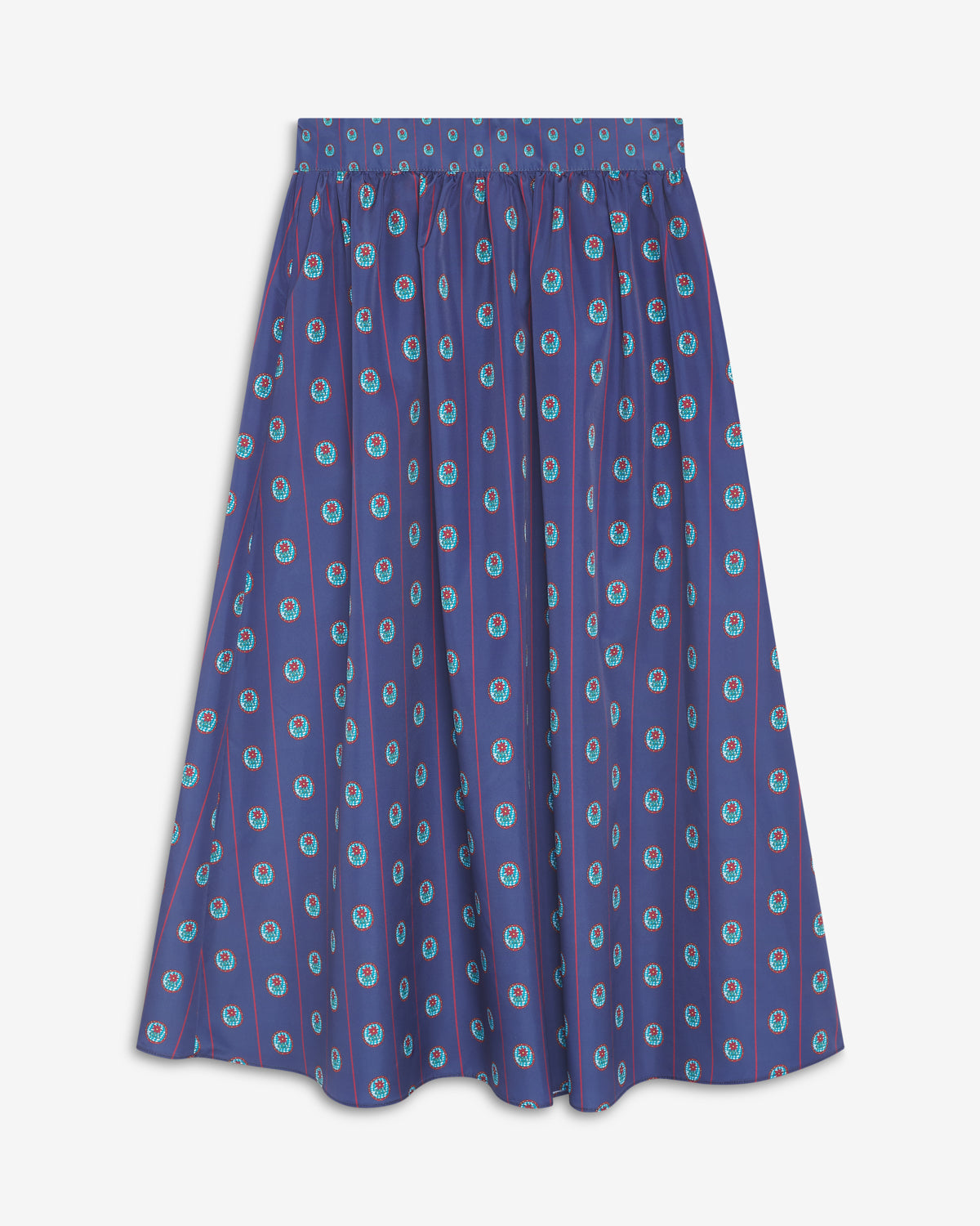 Falda larga de tiro alto con cinturilla ancha y frunces que aportan volumen.