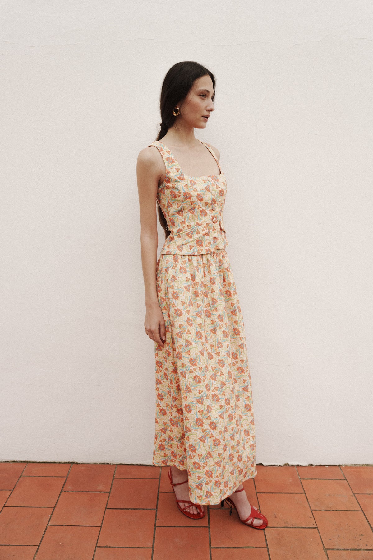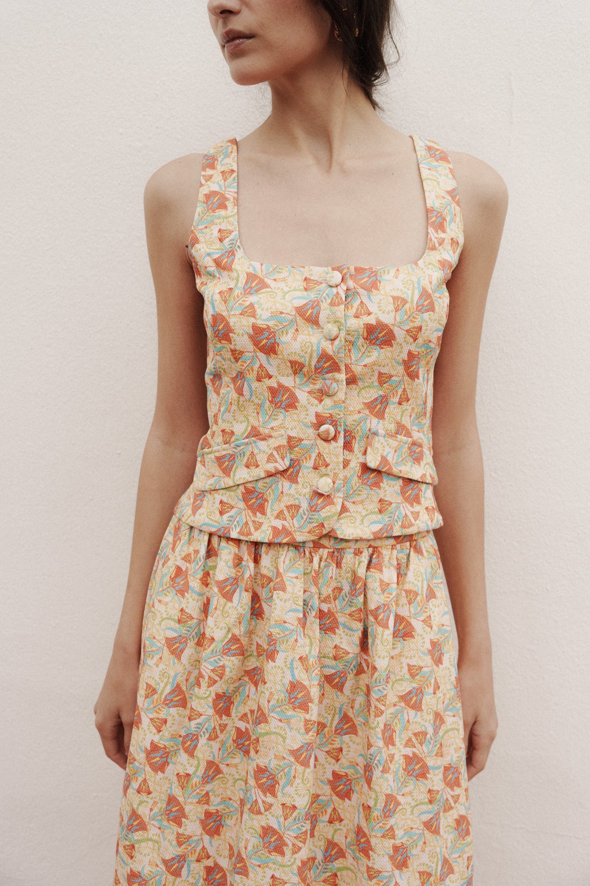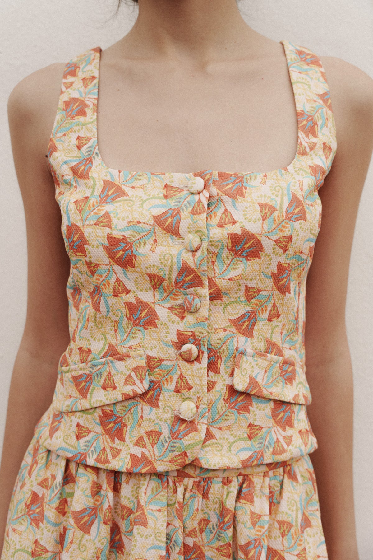 Aporta un aire de distinción artesanal a tu armario con el Top Bastet en tonos tierra y burdeos, una prenda de diseño exclusivo pensada para eventos que exigen sobriedad y estilo. Este chaleco estructurado destaca por su sofisticada paleta cromática y su impecable patronaje con pinzas que estilizan la figura femenina. Perfecto para crear un total look de invitada o elevar un conjunto de noche, su estampado artístico y acabado premium lo convierten en una inversión atemporal para cualquier celebración o gala.