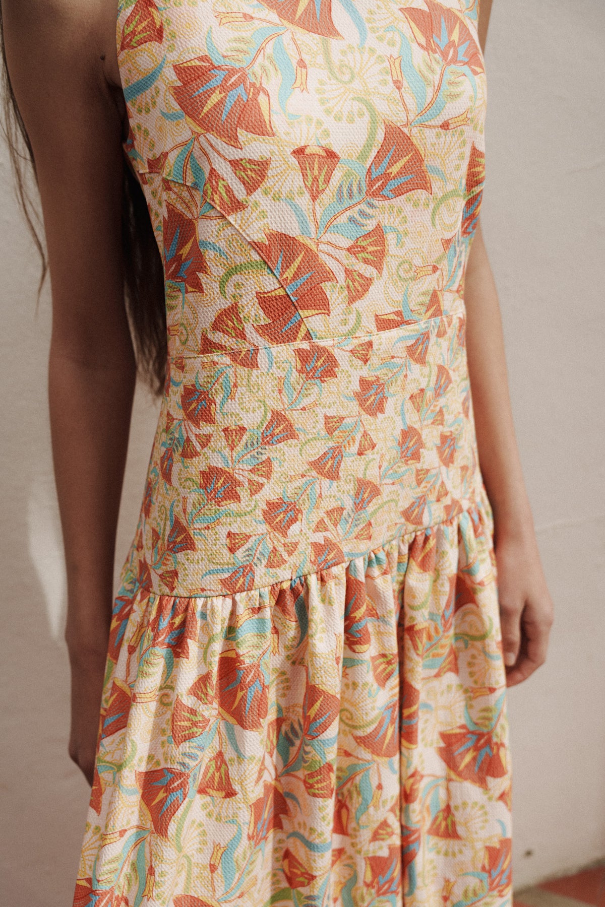 El Vestido Luxor Estampado es la pieza estrella para una invitada de boda que busca un equilibrio entre frescura y alta sofisticación. Con un diseño de cuello halter y espalda descubierta, este vestido largo destaca por su cuerpo entallado con detalles de mini volantes y una falda fluida que garantiza un movimiento espectacular. Su vibrante estampado floral en tonos naranja, turquesa y melocotón evoca una estética artística y veraniega, convirtiéndolo en el vestido de fiesta ideal para celebraciones de día o eventos exclusivos al aire libre donde la elegancia y el color son los protagonistas.