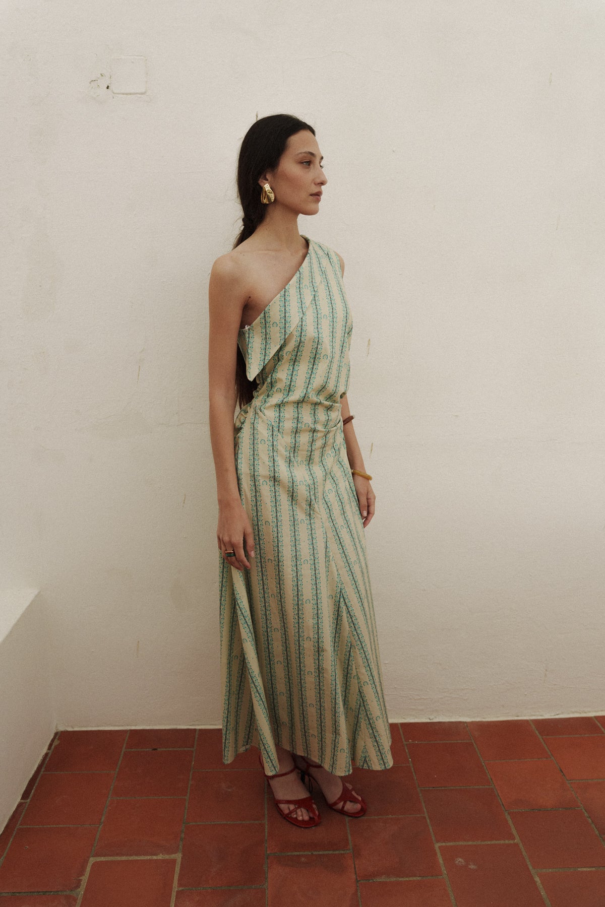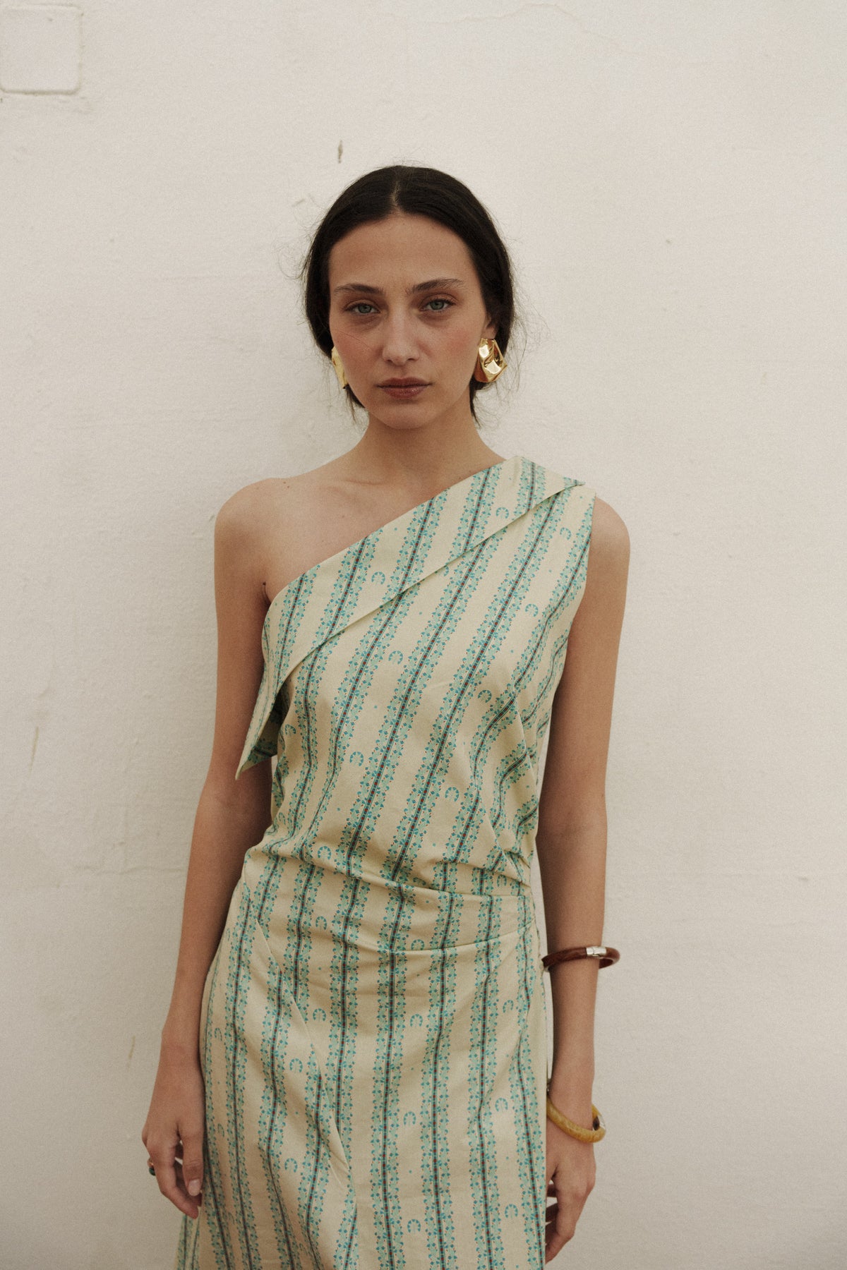 Deslumbra en tu próximo evento con el Vestido Nefertiti Estampado, una pieza única que une un patrón de inspiración clásica con un corte vanguardista. Su delicado estampado en tonos verde agua y crema sobre fondo neutro aporta un aire romántico y artesanal, mientras que su caída larga y detalles drapeados aseguran un movimiento elegante y distinguido. Es el vestido de fiesta perfecto para quienes buscan una estética romántica y original, posicionándose como una joya de diseño exclusivo para bodas de primavera o celebraciones especiales al aire libre.